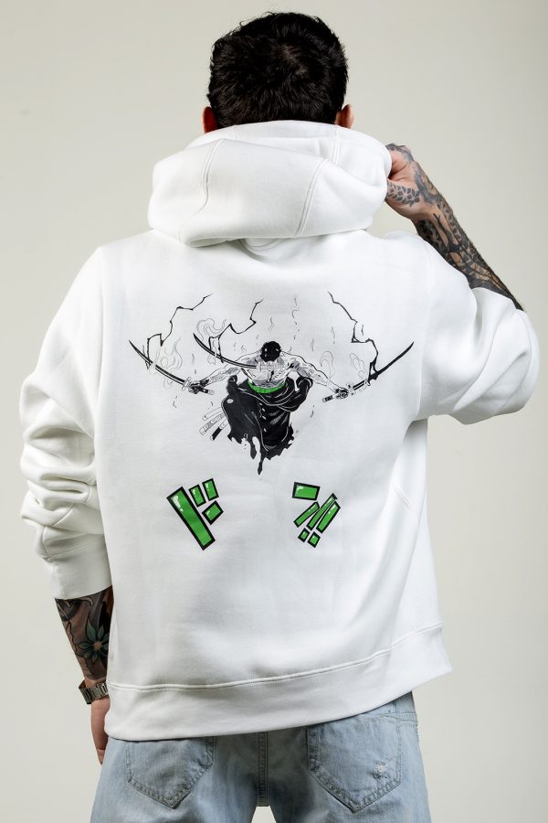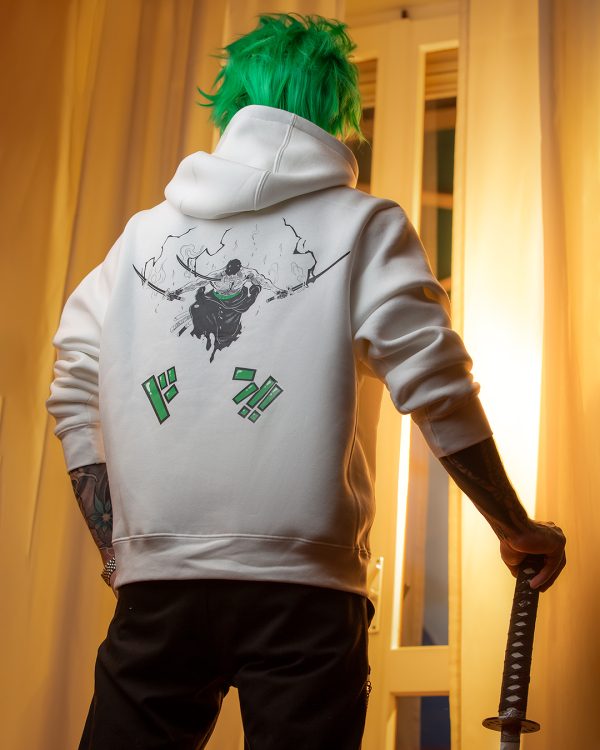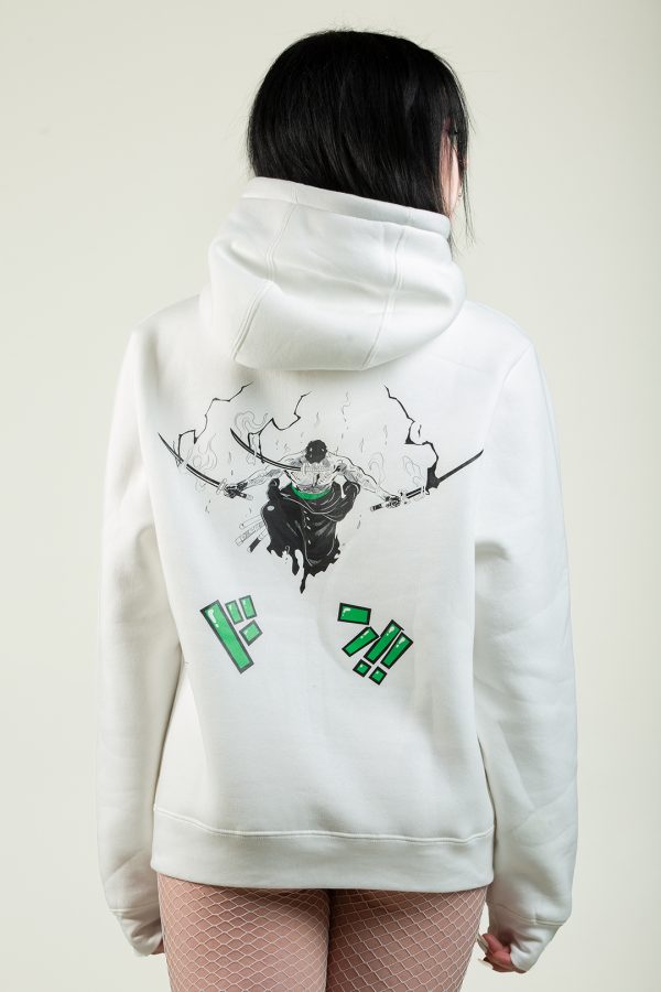 Abbiamo disegnato una felpa invernale felpata all'interno con materiali di alta qualità! Davanti troviamo sul petto una stampa serigrafica con l'occhio di zoro, mentre dietro abbiamo ridisegnato il combattimento di Zoro vs King!